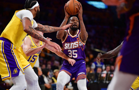 易邊再戰(zhàn),杜蘭特持續(xù)得分輸出,開場連拿5分拉開差距,但另一邊湖人也沒有束手就擒,主力陣容的戴維斯和里夫斯連續(xù)得分打成,保持分差在個位數(shù)。第3節(jié)進行到中段,八村壘連續(xù)打成進攻提振士氣,隨后雙方進入防守大戰(zhàn),但僵局在節(jié)末打破,杜蘭特的硬解得分再次幫助太陽拉開領(lǐng)先優(yōu)勢,第3節(jié)結(jié)束時太陽以84-72領(lǐng)先湖人。